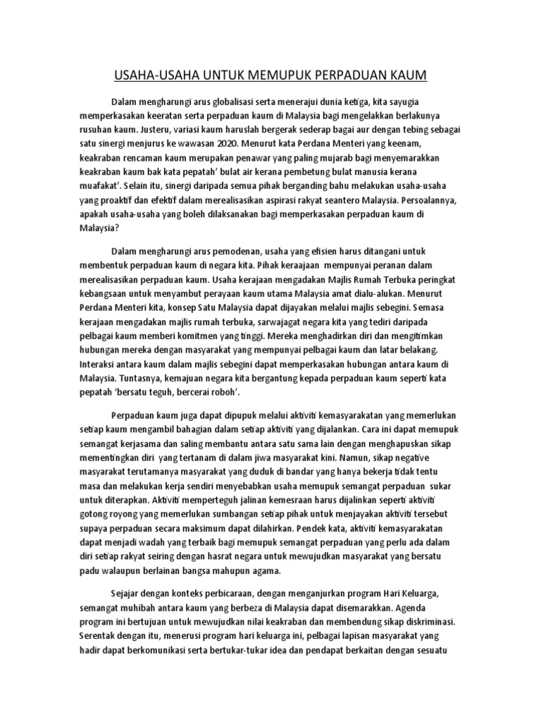 Sarankan usaha-usaha meperkukuh perpaduan kaum dalam kalangan masyarakat di negara kita. Contoh karangan usaha memupuk perpaduan kaum. Konsep ini sebenarnya telahpun.